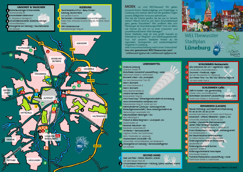 Der WELTbewusste Stadtplan für Lüneburg ist endlich da! Janun Lüneburg hat ihn erstellt, gedruckt und gleichzeitig alle Einträge auf der Karte von morgen eingetragen.