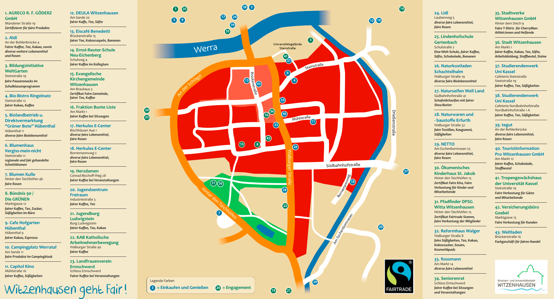 Auf der Innenseite ist die Karte der Kleinstadt mit 43 Einträgen rund um ethischen Handel. Auf der Rückseite sind zusätzliche Infos zu „Was ist fairer Handel“, woran man ihn erkennt und wie wie man Aktiv werden kann, für den fairen Handel in Witzenhausen.